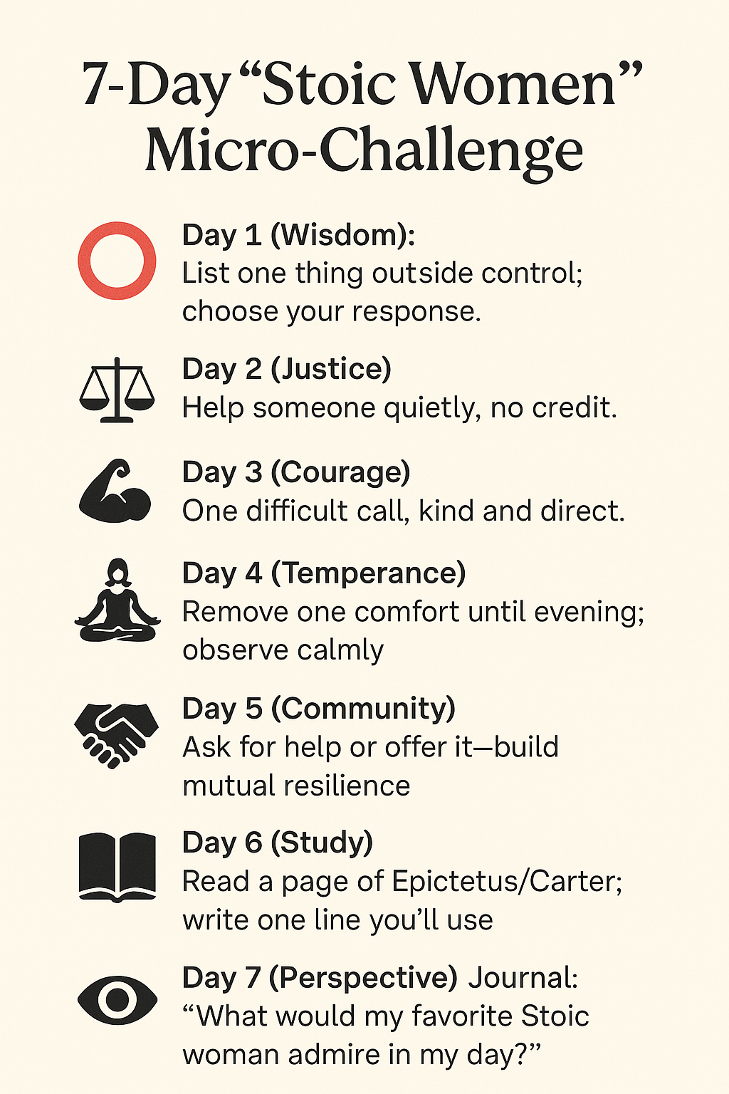 - 👁️ Day 7 (Perspective): Journal: “What would my favorite Stoic woman admire in my day?”